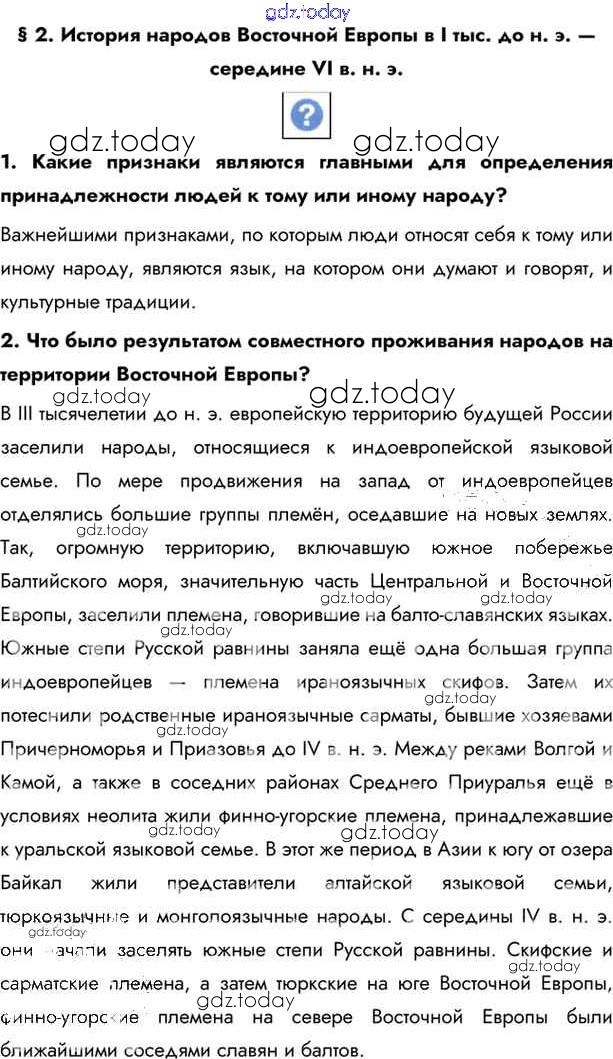 На страницах сайта gdz.today вы найдете учебный и вспомогательный материал, направленный на улучшения знаний школьной программы. ГДЗ - онлайн мир знаний §2. История народов Восточной Европы в I тыс. до н.э. – средине VI в. н.э. Учебник 2016 (решение) стр.21 Учебнику по Истории России для 6 класса Андреев, Федоров Дрофа, Дрофа Вертикаль 2016, 2020