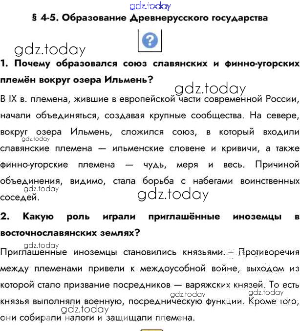 На страницах сайта gdz.today вы найдете учебный и вспомогательный материал, направленный на улучшения знаний школьной программы. ГДЗ - онлайн мир знаний §4-5. Образование Древнерусского государства Учебник 2016 (решение) стр.40 Учебнику по Истории России для 6 класса Андреев, Федоров Дрофа, Дрофа Вертикаль 2016, 2020