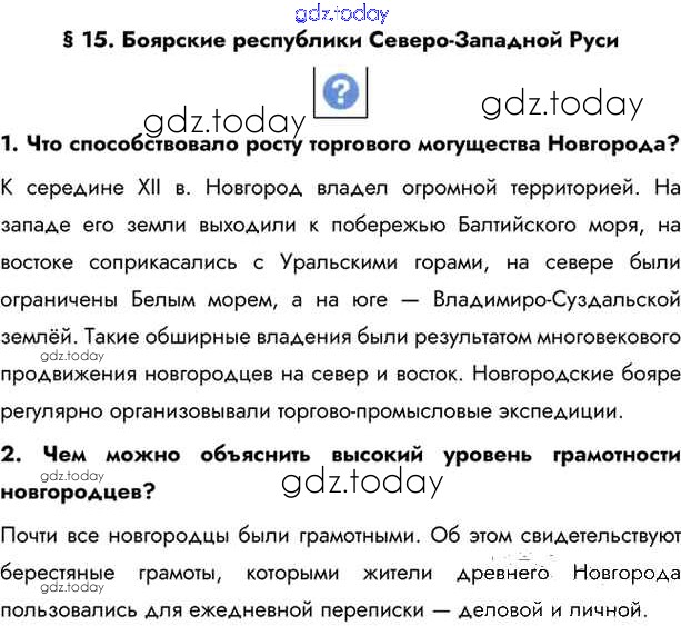 На страницах сайта gdz.today вы найдете учебный и вспомогательный материал, направленный на улучшения знаний школьной программы. ГДЗ - онлайн мир знаний §15. Боярские республики Северо - Западной Руси Учебник 2016 (решение) стр.108 Учебнику по Истории России для 6 класса Андреев, Федоров Дрофа, Дрофа Вертикаль 2016, 2020