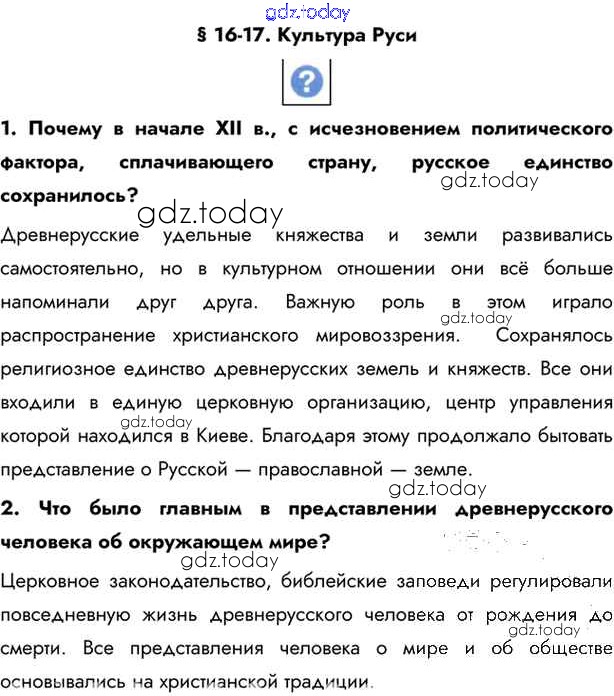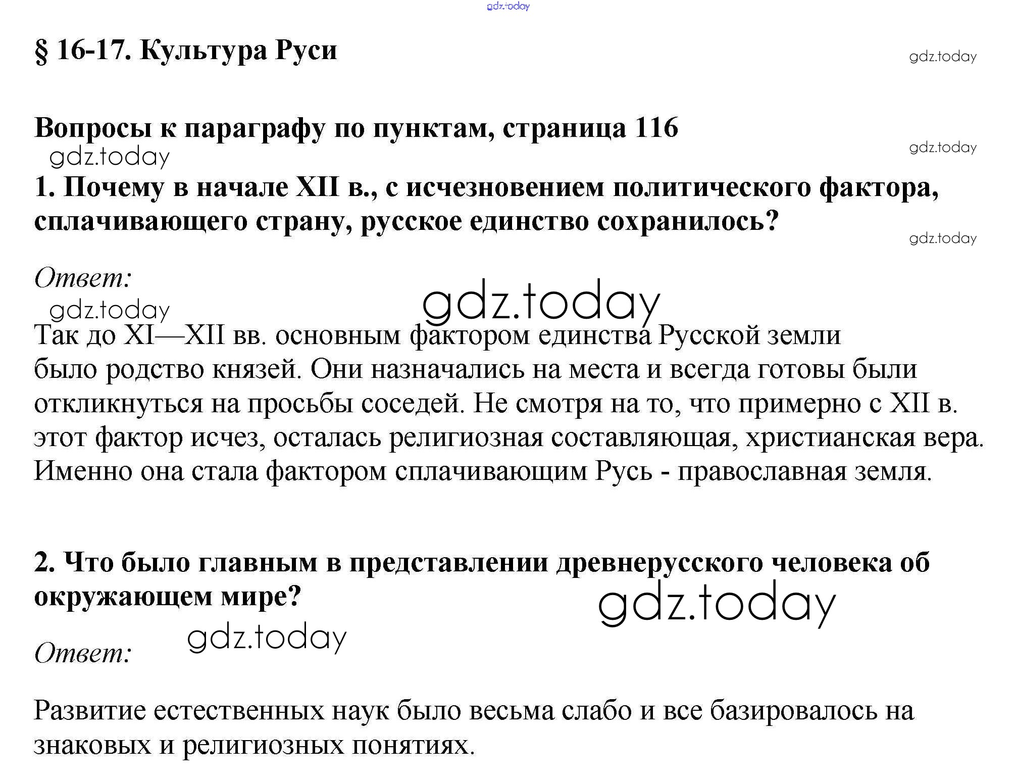 На страницах сайта gdz.today вы найдете учебный и вспомогательный материал, направленный на улучшения знаний школьной программы. ГДЗ - онлайн мир знаний §16-17. Культура Руси Учебник 2016 (решение) стр.116 Учебнику по Истории России для 6 класса Андреев, Федоров Дрофа, Дрофа Вертикаль 2016, 2020