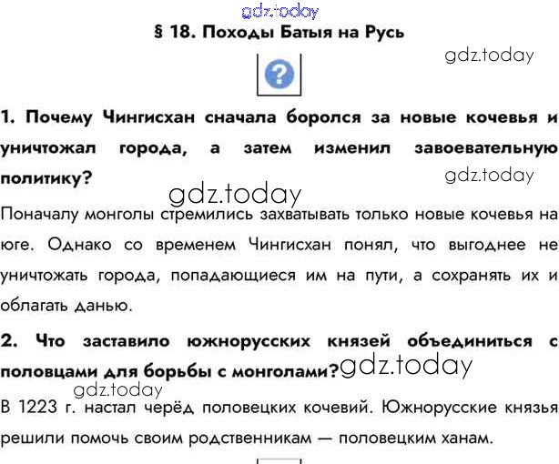 На страницах сайта gdz.today вы найдете учебный и вспомогательный материал, направленный на улучшения знаний школьной программы. ГДЗ - онлайн мир знаний §18. Походы Батыя на Русь Учебник 2016 (решение) стр.128 Учебнику по Истории России для 6 класса Андреев, Федоров Дрофа, Дрофа Вертикаль 2016, 2020