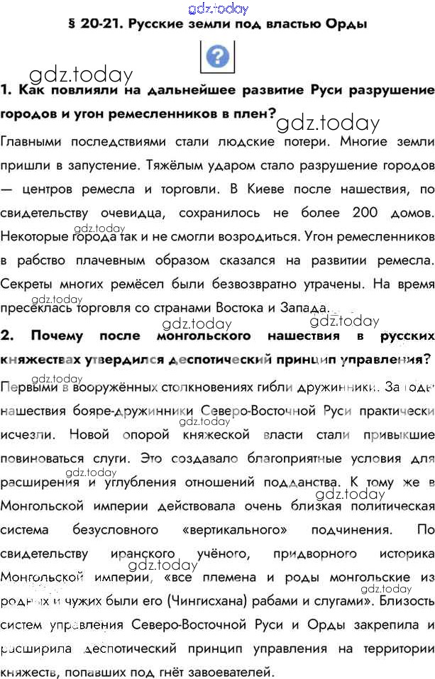 На страницах сайта gdz.today вы найдете учебный и вспомогательный материал, направленный на улучшения знаний школьной программы. ГДЗ - онлайн мир знаний §20-21. Русские земли под властью Орды Учебник 2016 (решение) стр.144 Учебнику по Истории России для 6 класса Андреев, Федоров Дрофа, Дрофа Вертикаль 2016, 2020