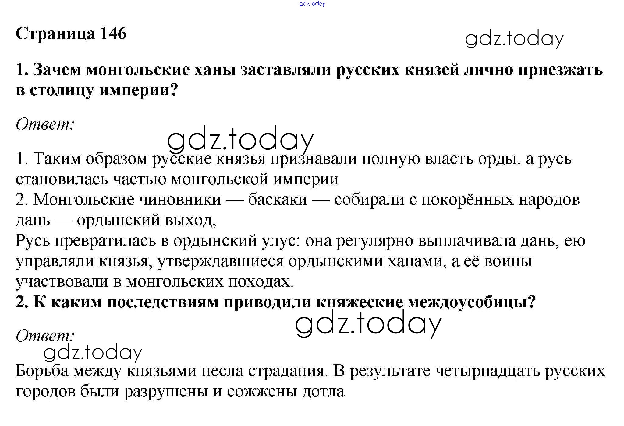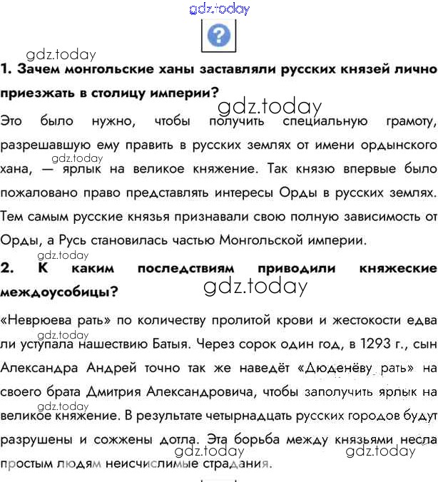На страницах сайта gdz.today вы найдете учебный и вспомогательный материал, направленный на улучшения знаний школьной программы. ГДЗ - онлайн мир знаний §20-21. Русские земли под властью Орды Учебник 2016 (решение) стр.146 Учебнику по Истории России для 6 класса Андреев, Федоров Дрофа, Дрофа Вертикаль 2016, 2020
