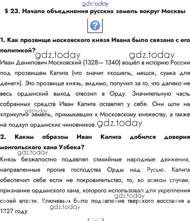 На страницах сайта gdz.today вы найдете учебный и вспомогательный материал, направленный на улучшения знаний школьной программы. ГДЗ - онлайн мир знаний §23. Начало объединения русских земель вокруг Москвы Учебник 2016 (решение) стр.164 Учебнику по Истории России для 6 класса Андреев, Федоров Дрофа, Дрофа Вертикаль 2016, 2020