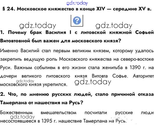 На страницах сайта gdz.today вы найдете учебный и вспомогательный материал, направленный на улучшения знаний школьной программы. ГДЗ - онлайн мир знаний §24. Московское княжество в конце XIV - середине XV веков Учебник 2016 (решение) стр.173 Учебнику по Истории России для 6 класса Андреев, Федоров Дрофа, Дрофа Вертикаль 2016, 2020