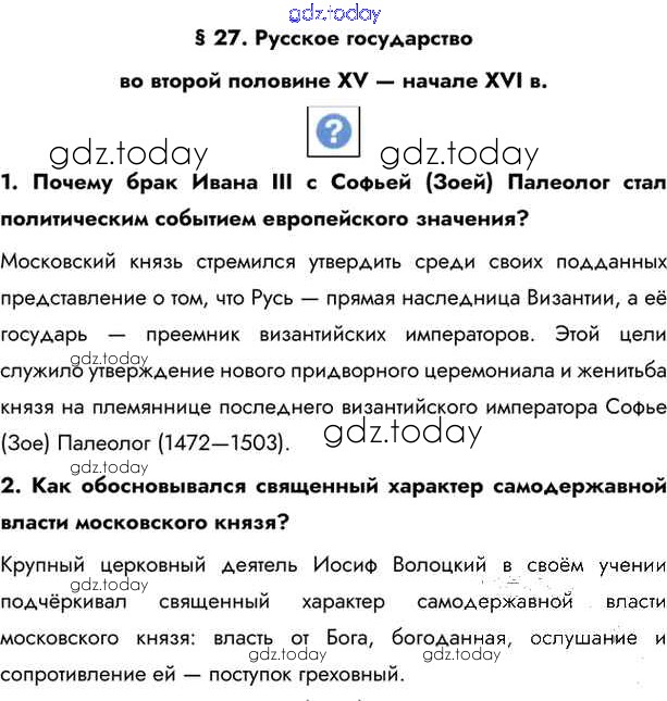 На страницах сайта gdz.today вы найдете учебный и вспомогательный материал, направленный на улучшения знаний школьной программы. ГДЗ - онлайн мир знаний §27. Русское государство во второй половине XV - начале XVI вв. Учебник 2016 (решение) стр.204 Учебнику по Истории России для 6 класса Андреев, Федоров Дрофа, Дрофа Вертикаль 2016, 2020