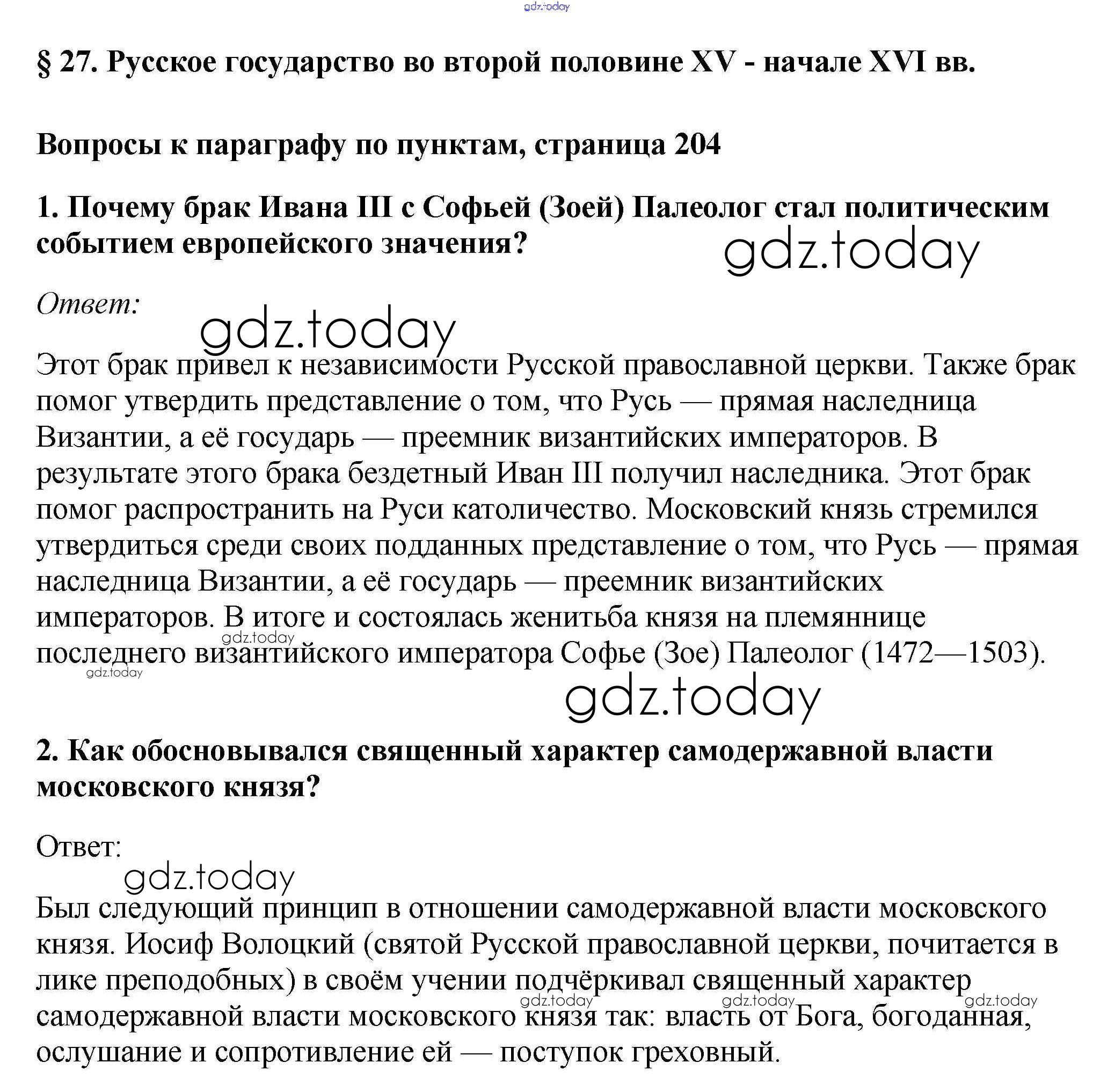 Ответы к §27. Русское государство во второй половине XV - начале XVI вв. Учебник 2016 (решение) стр.204 Учебнику по Истории России для 6 класса Андреев, Федоров Дрофа, Дрофа Вертикаль 2016, 2020