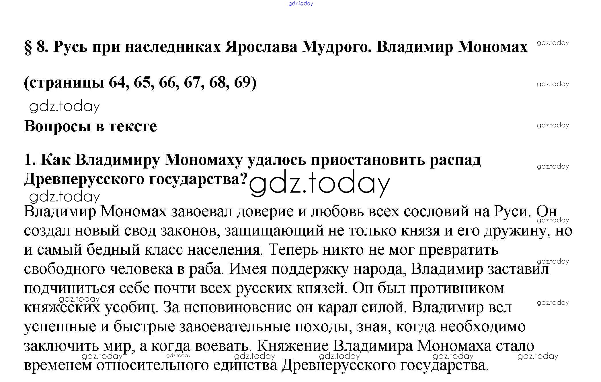 На страницах сайта gdz.today вы найдете учебный и вспомогательный материал, направленный на улучшения знаний школьной программы. ГДЗ - онлайн мир знаний Вопросы в тексте Решение к §8 1 Учебнику по Истории России для 6 класса Арсентьев, Данилов Просвещение 2016