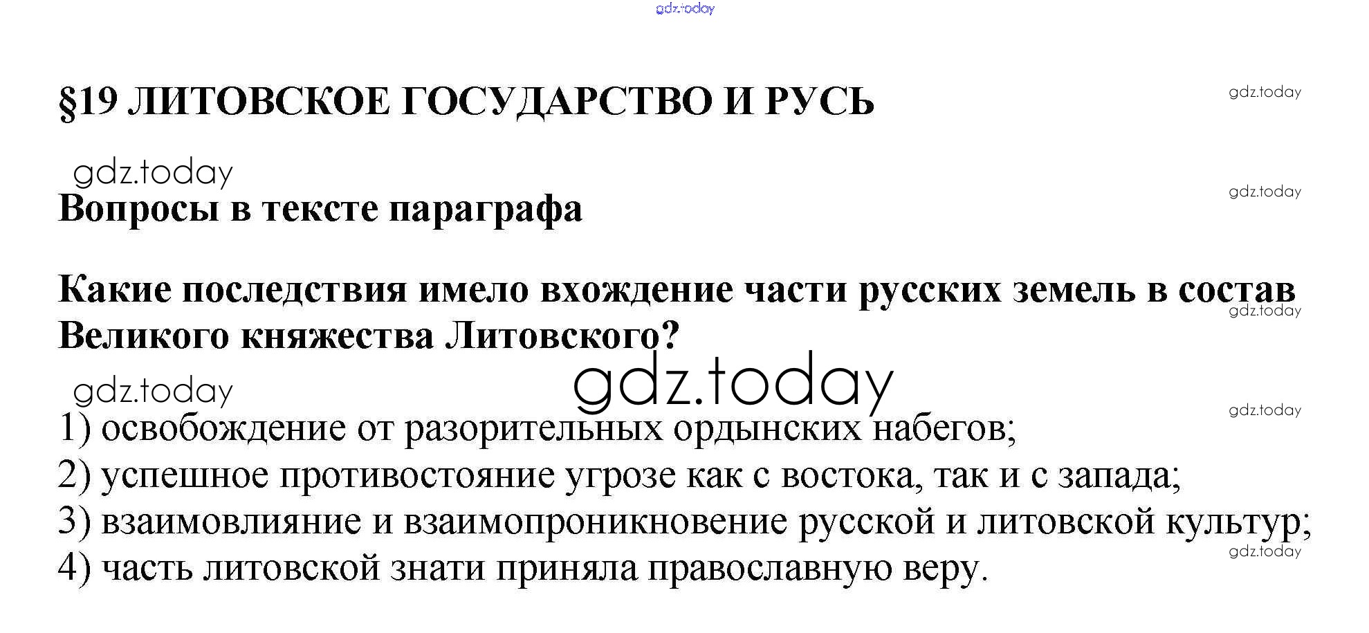 На страницах сайта gdz.today вы найдете учебный и вспомогательный материал, направленный на улучшения знаний школьной программы. ГДЗ - онлайн мир знаний Вопросы в тексте Решение к §19 1 Учебнику по Истории России для 6 класса Арсентьев, Данилов Просвещение 2016
