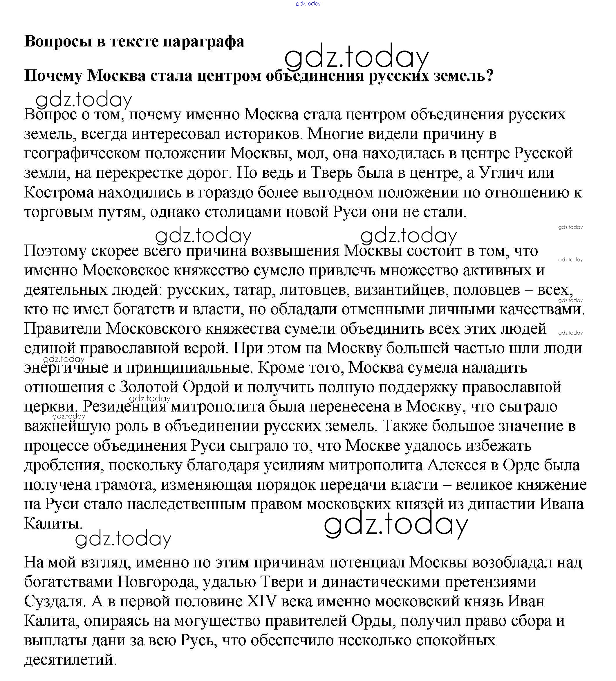 На страницах сайта gdz.today вы найдете учебный и вспомогательный материал, направленный на улучшения знаний школьной программы. ГДЗ - онлайн мир знаний Вопросы в тексте Решение к §20 1 Учебнику по Истории России для 6 класса Арсентьев, Данилов Просвещение 2016