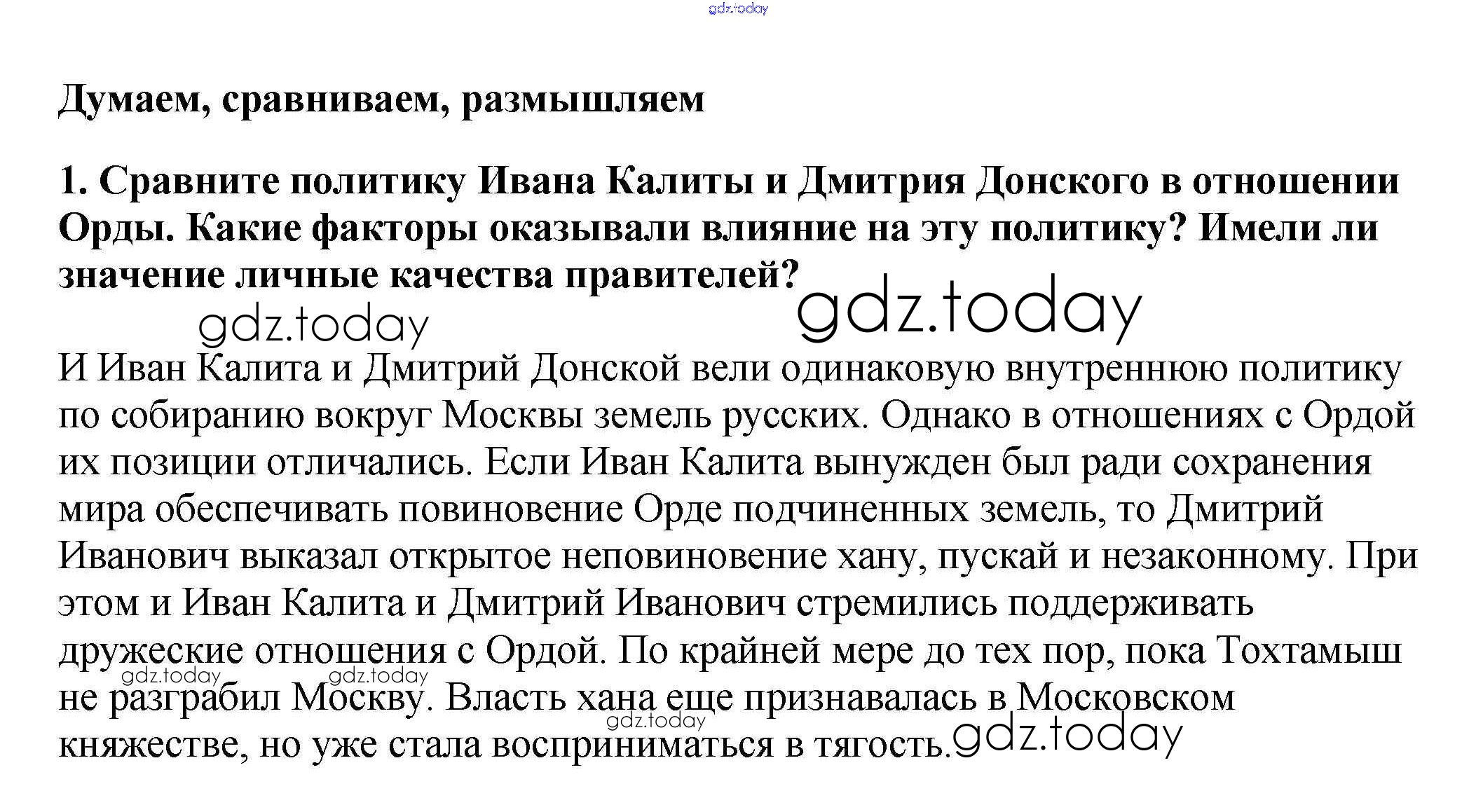 На страницах сайта gdz.today вы найдете учебный и вспомогательный материал, направленный на улучшения знаний школьной программы. ГДЗ - онлайн мир знаний Думаем, сравниваем, размышляем Решение к §21 1 Учебнику по Истории России для 6 класса Арсентьев, Данилов Просвещение 2016
