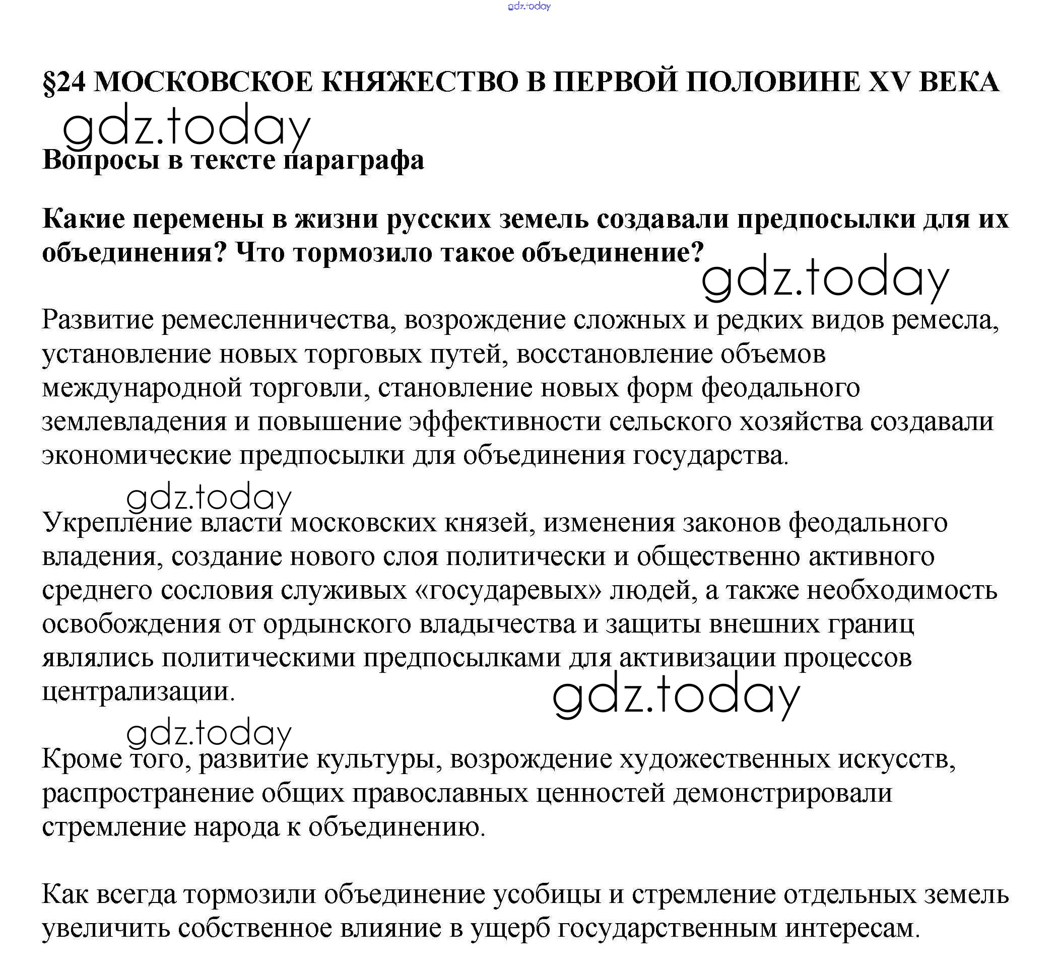 На страницах сайта gdz.today вы найдете учебный и вспомогательный материал, направленный на улучшения знаний школьной программы. ГДЗ - онлайн мир знаний Вопросы в тексте Решение к §24 1 Учебнику по Истории России для 6 класса Арсентьев, Данилов Просвещение 2016