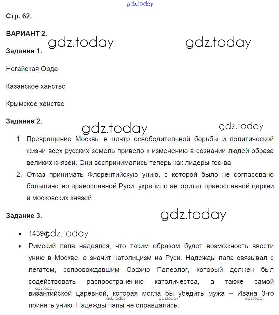 На страницах сайта gdz.today вы найдете учебный и вспомогательный материал, направленный на улучшения знаний школьной программы. ГДЗ - онлайн мир знаний Страницы (решение) 62 Контрольным работам по Истории России для 6 класса Артасов Просвещение УМК 2016