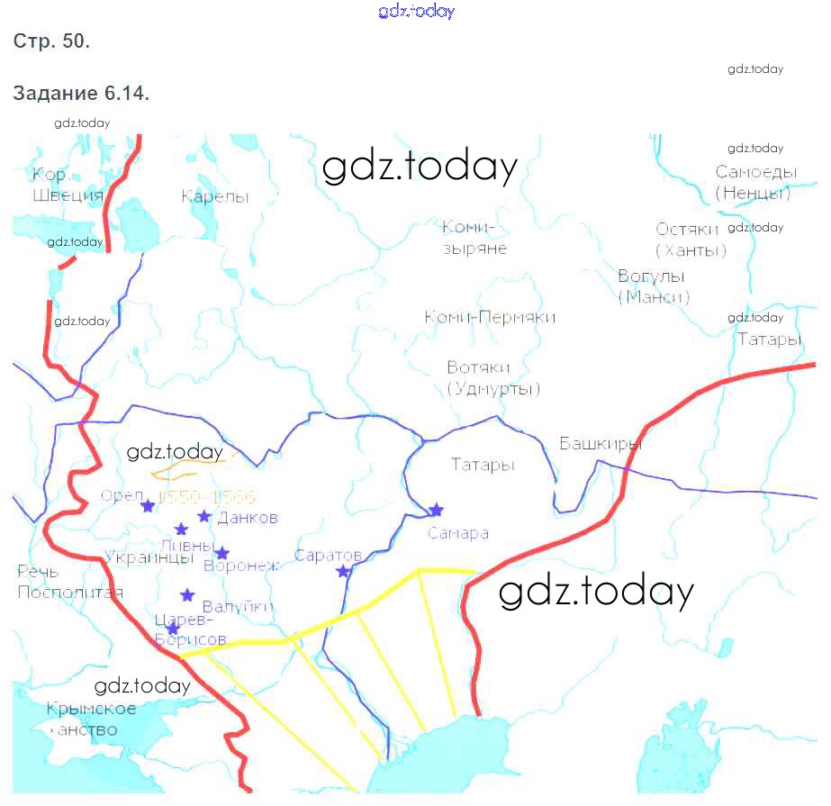 На страницах сайта gdz.today вы найдете учебный и вспомогательный материал, направленный на улучшения знаний школьной программы. ГДЗ - онлайн мир знаний Страницы (решение) 50 Рабочей тетради с контурными картами по Истории России для 6 класса Симонова Экзамен УМК 2018