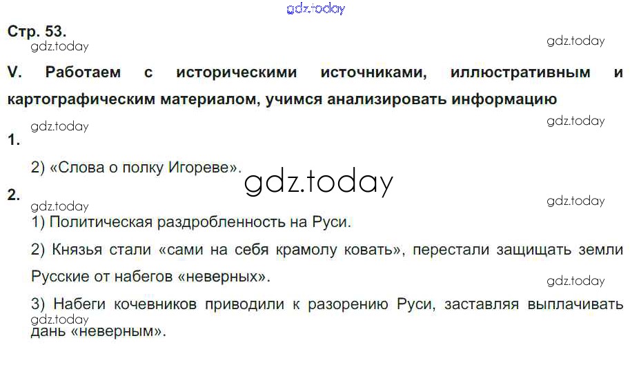 На страницах сайта gdz.today вы найдете учебный и вспомогательный материал, направленный на улучшения знаний школьной программы. ГДЗ - онлайн мир знаний Страницы (решение) 53 Рабочей тетради по Истории России для 6 класса Гевуркова Экзамен УМК 2018
