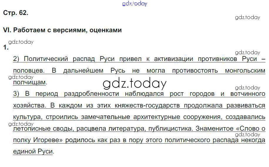 На страницах сайта gdz.today вы найдете учебный и вспомогательный материал, направленный на улучшения знаний школьной программы. ГДЗ - онлайн мир знаний Страницы (решение) 62 Рабочей тетради по Истории России для 6 класса Гевуркова Экзамен УМК 2018