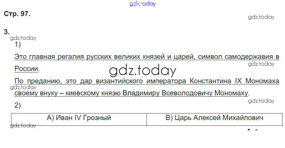 На страницах сайта gdz.today вы найдете учебный и вспомогательный материал, направленный на улучшения знаний школьной программы. ГДЗ - онлайн мир знаний Страницы (решение) 97 Рабочей тетради по Истории России для 6 класса Гевуркова Экзамен УМК 2018