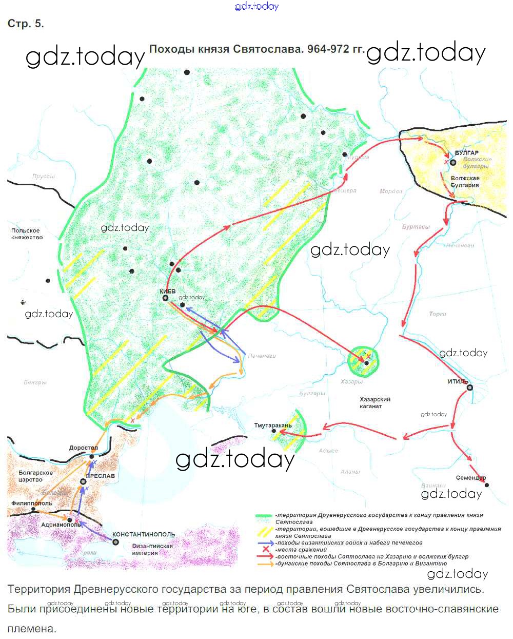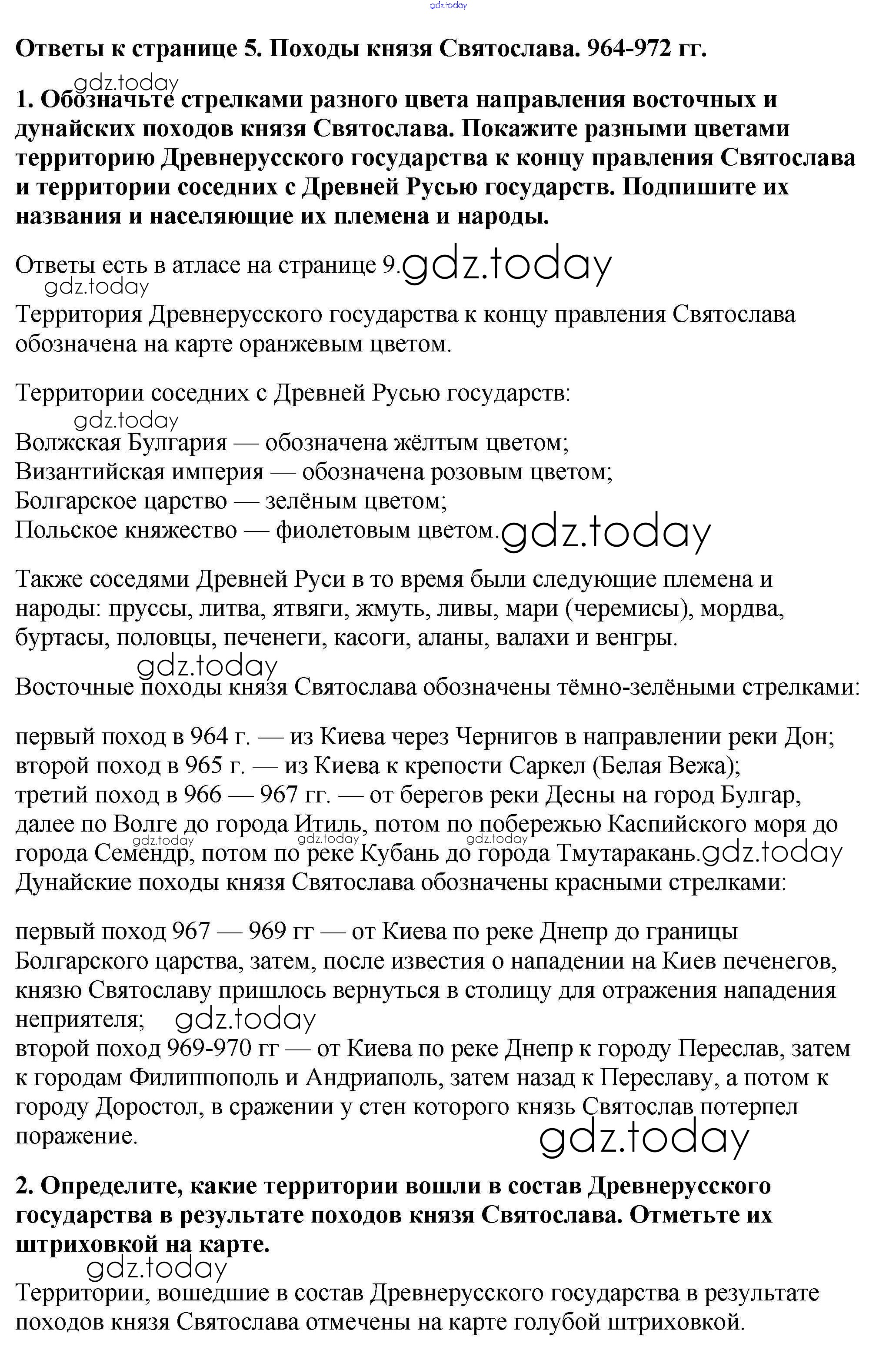 На страницах сайта gdz.today вы найдете учебный и вспомогательный материал, направленный на улучшения знаний школьной программы. ГДЗ - онлайн мир знаний Страницы (решение) Страница 5. Походы князя Святослава. 964-972 гг. Контурным картам по Истории России для 6 класса Тороп Дрофа УМК 2019