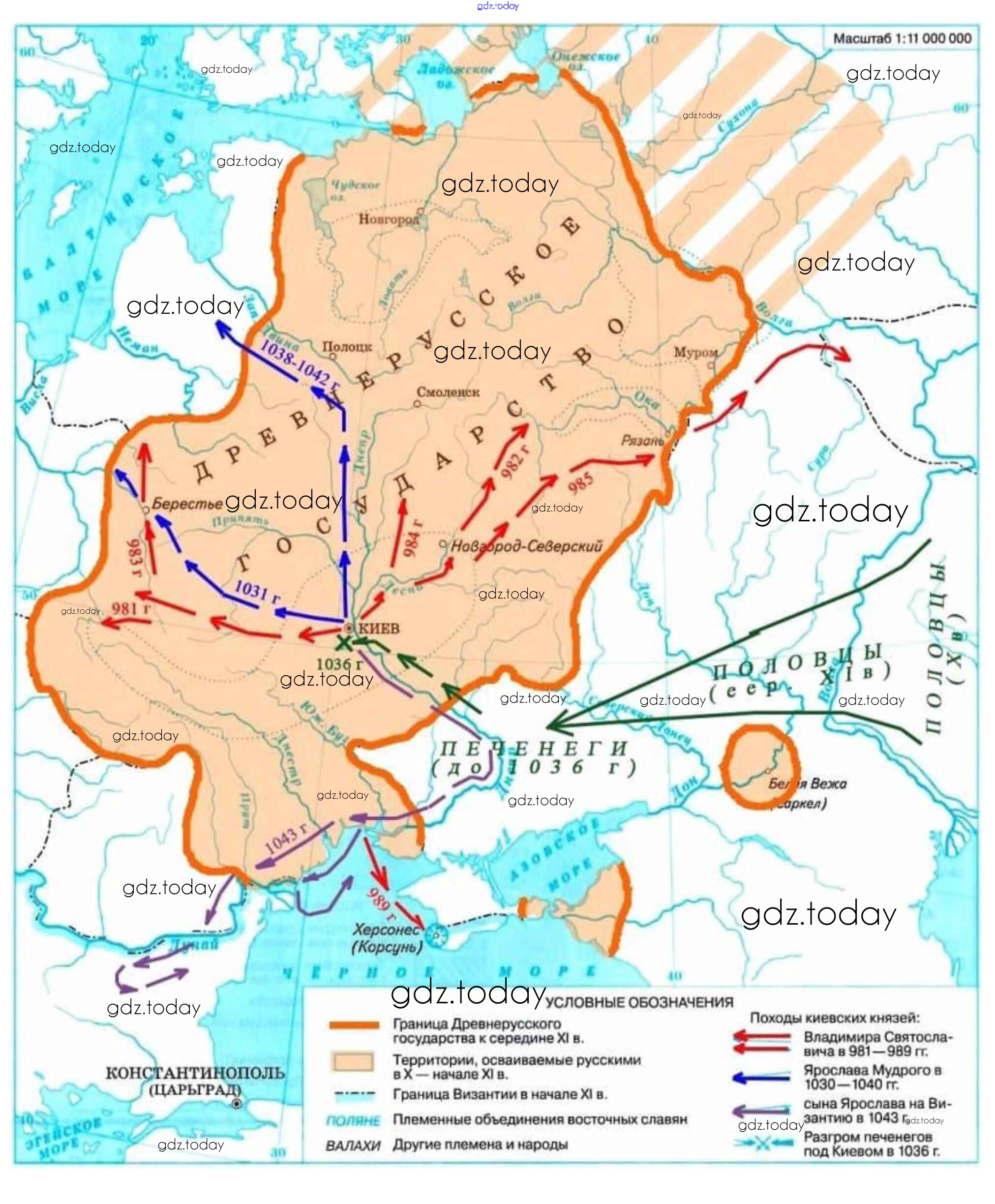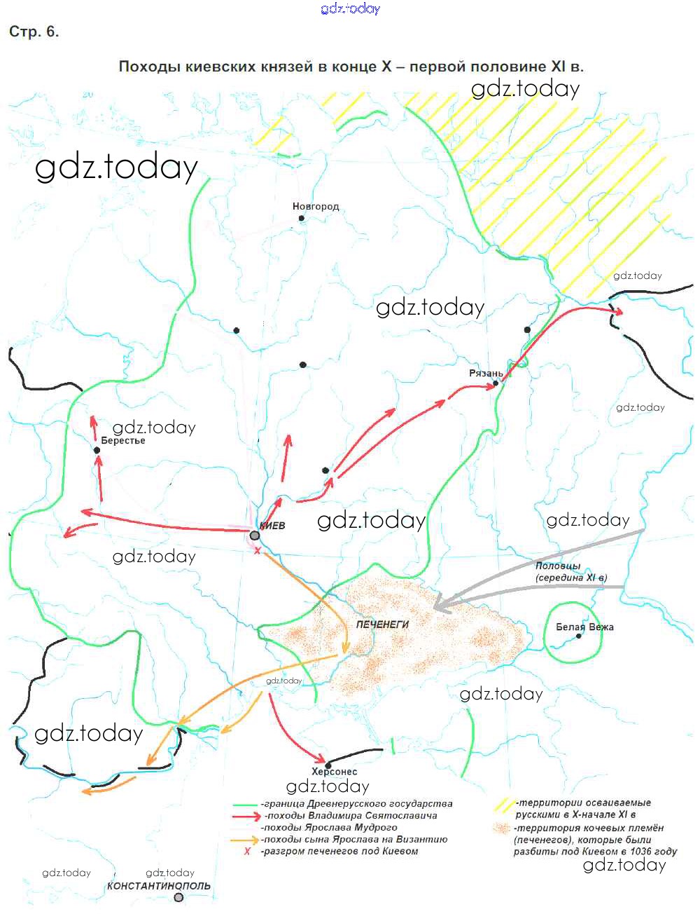 На страницах сайта gdz.today вы найдете учебный и вспомогательный материал, направленный на улучшения знаний школьной программы. ГДЗ - онлайн мир знаний Страницы (решение) Страница 6. Походы киевских князей в конце 10- первой половине 11 в. Контурным картам по Истории России для 6 класса Тороп Дрофа УМК 2019