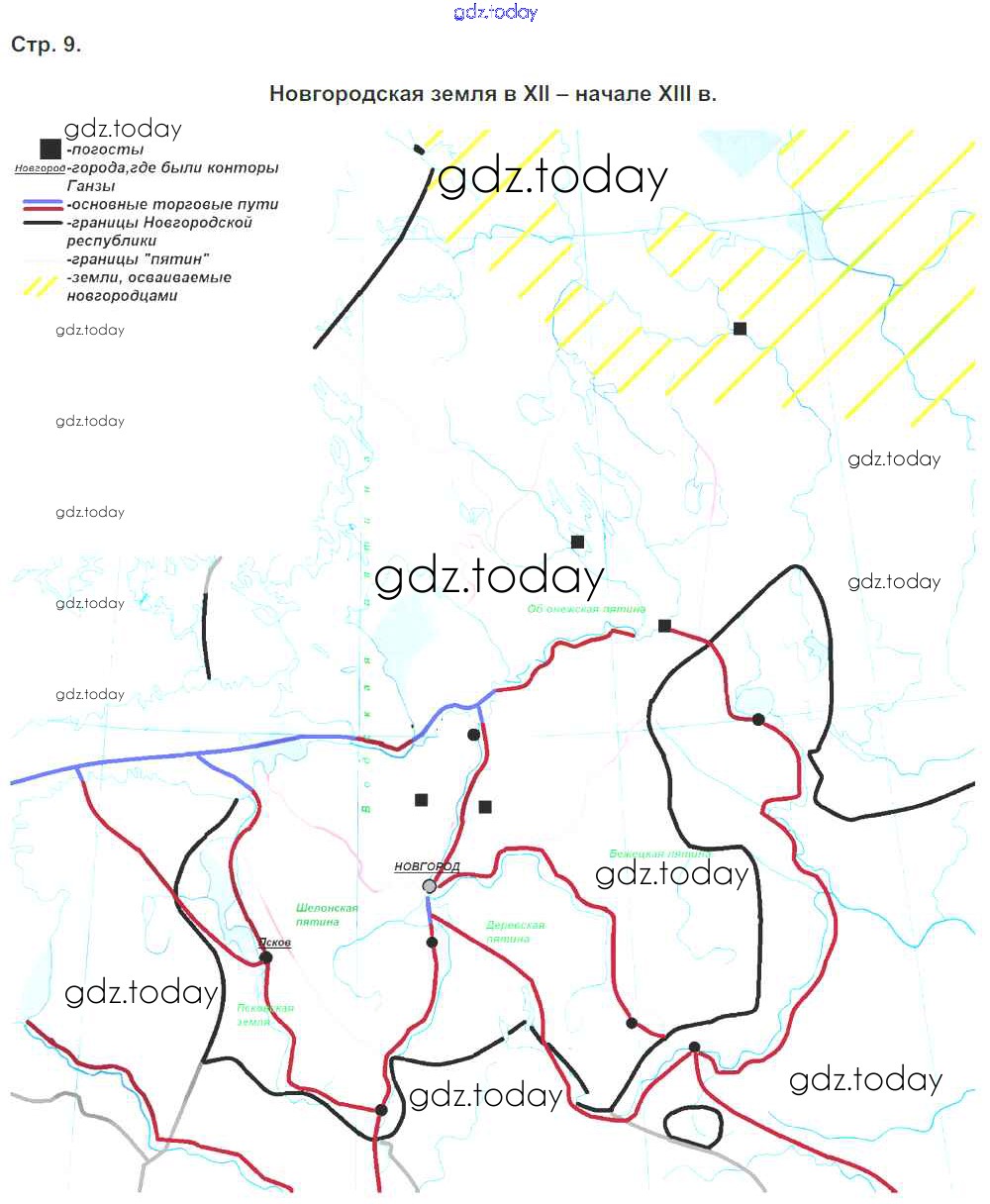 Ответы к Страницы (решение) Страница 9. Новгородская земля в 12 - начале 13 в. Контурным картам по Истории России для 6 класса Тороп Дрофа УМК 2019