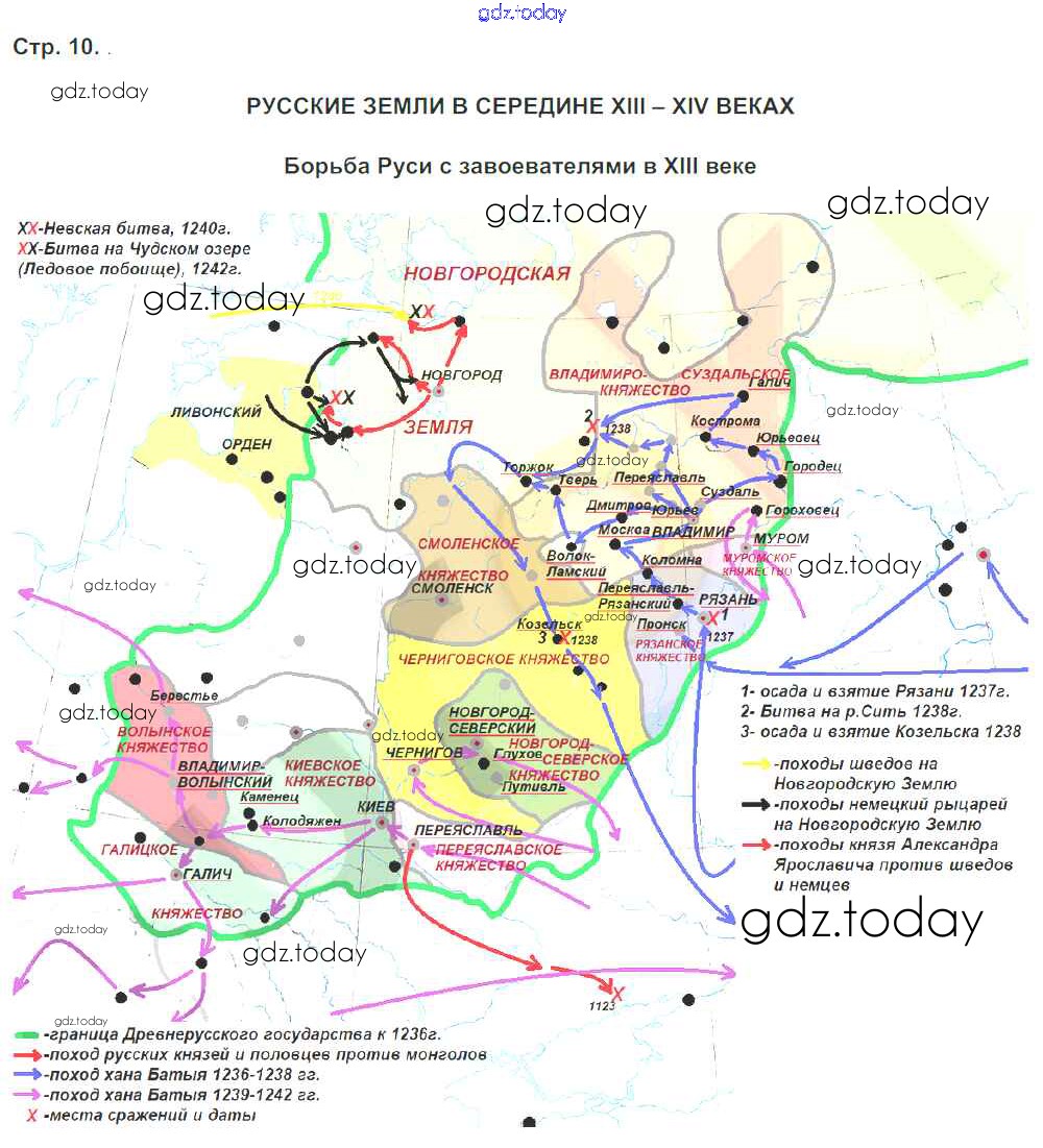 На страницах сайта gdz.today вы найдете учебный и вспомогательный материал, направленный на улучшения знаний школьной программы. ГДЗ - онлайн мир знаний Решение к теме Русь в середине XIII в. - начале XIV в. страница 10 Контурным картам по Истории России для 6 класса Тороп Просвещение УМК 2015