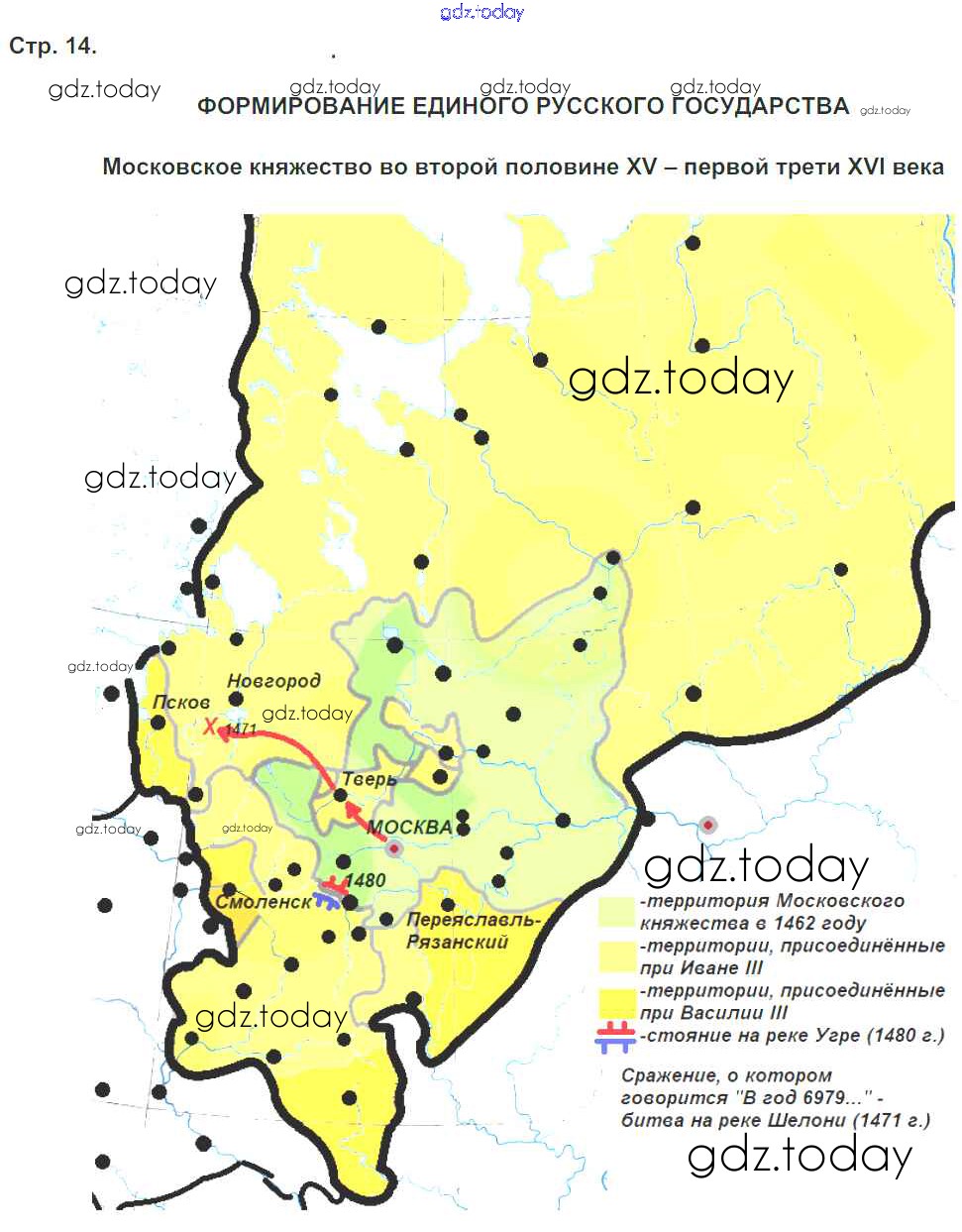 На страницах сайта gdz.today вы найдете учебный и вспомогательный материал, направленный на улучшения знаний школьной программы. ГДЗ - онлайн мир знаний Решение к теме Формирование единого русского государства страница 14 Контурным картам по Истории России для 6 класса Тороп Просвещение УМК 2015