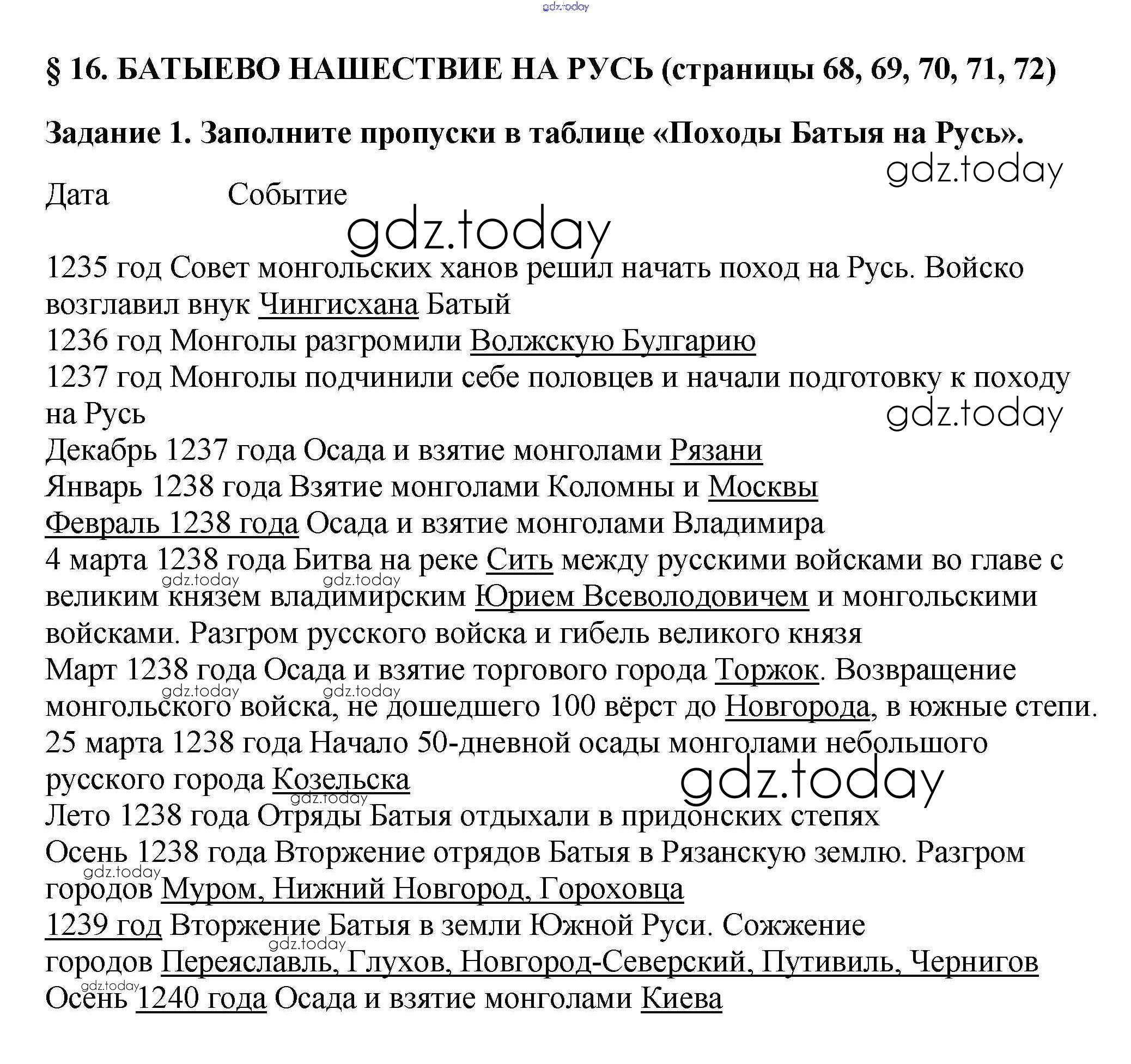 На страницах сайта gdz.today вы найдете учебный и вспомогательный материал, направленный на улучшения знаний школьной программы. ГДЗ - онлайн мир знаний Решение к §16 стр. 68 Рабочей тетради по Истории России для 6 класса Артасов, Данилов Просвещение 2016