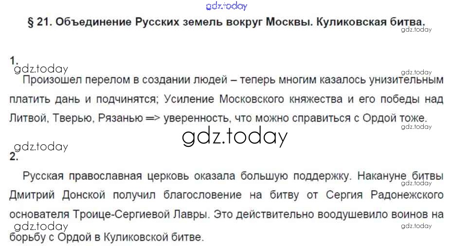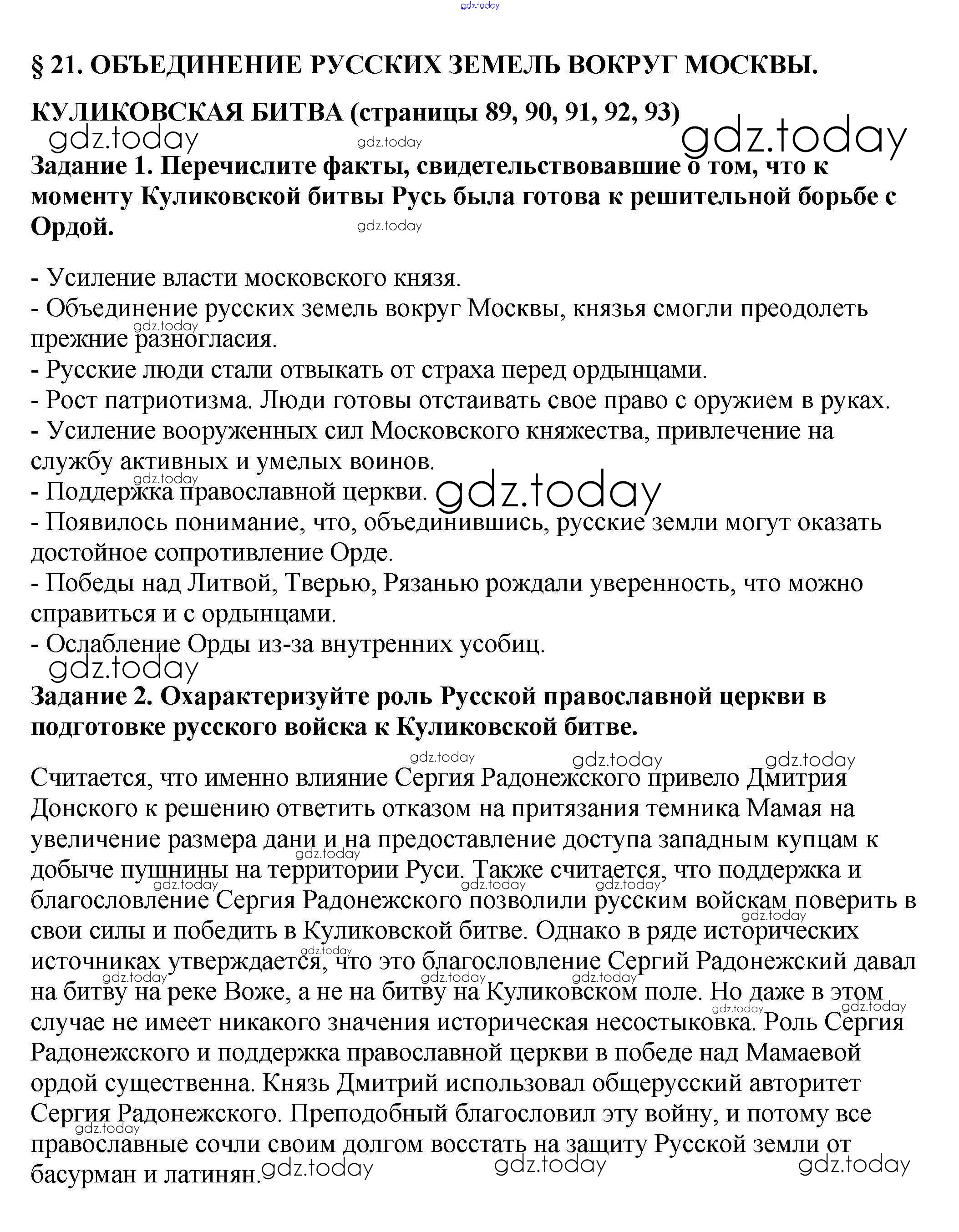 На страницах сайта gdz.today вы найдете учебный и вспомогательный материал, направленный на улучшения знаний школьной программы. ГДЗ - онлайн мир знаний Решение к §21 стр. 89 Рабочей тетради по Истории России для 6 класса Артасов, Данилов Просвещение 2016