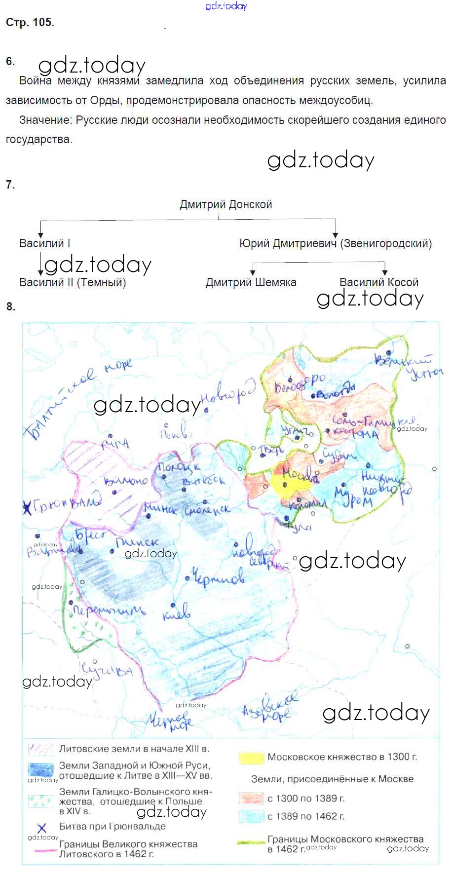 На страницах сайта gdz.today вы найдете учебный и вспомогательный материал, направленный на улучшения знаний школьной программы. ГДЗ - онлайн мир знаний Решение к §24 стр. 105 Рабочей тетради по Истории России для 6 класса Артасов, Данилов Просвещение 2016