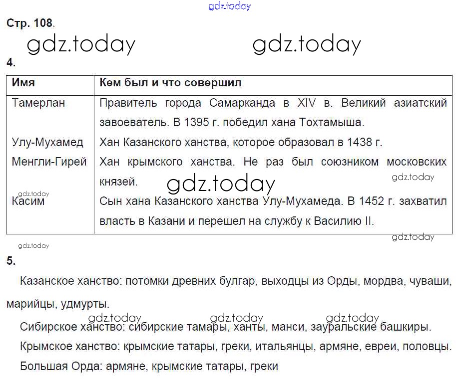 На страницах сайта gdz.today вы найдете учебный и вспомогательный материал, направленный на улучшения знаний школьной программы. ГДЗ - онлайн мир знаний Решение к §25 стр. 108 Рабочей тетради по Истории России для 6 класса Артасов, Данилов Просвещение 2016