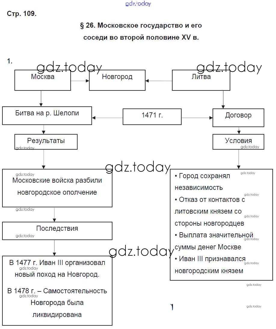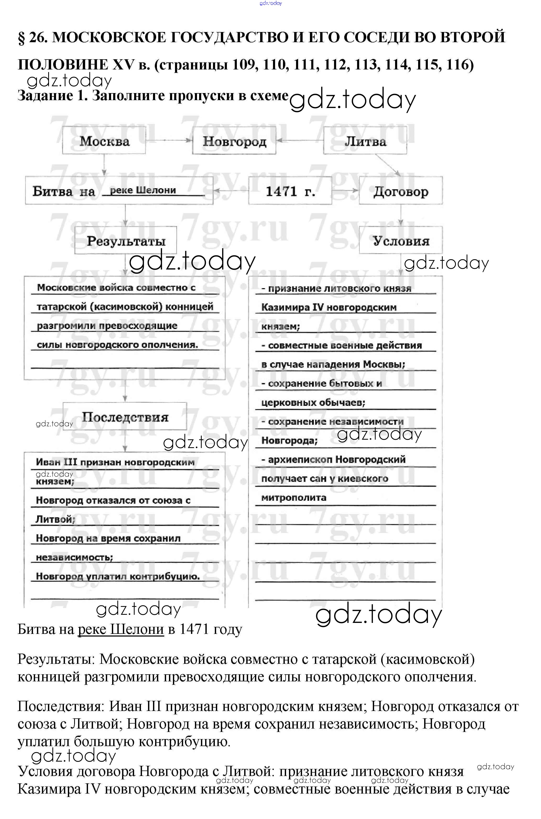 На страницах сайта gdz.today вы найдете учебный и вспомогательный материал, направленный на улучшения знаний школьной программы. ГДЗ - онлайн мир знаний Решение к §26 стр. 109 Рабочей тетради по Истории России для 6 класса Артасов, Данилов Просвещение 2016