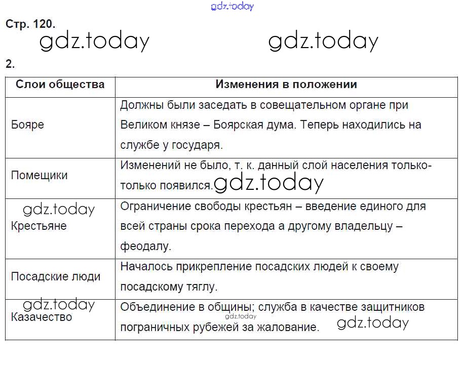 На страницах сайта gdz.today вы найдете учебный и вспомогательный материал, направленный на улучшения знаний школьной программы. ГДЗ - онлайн мир знаний Решение к §26 стр. 120 Рабочей тетради по Истории России для 6 класса Артасов, Данилов Просвещение 2016
