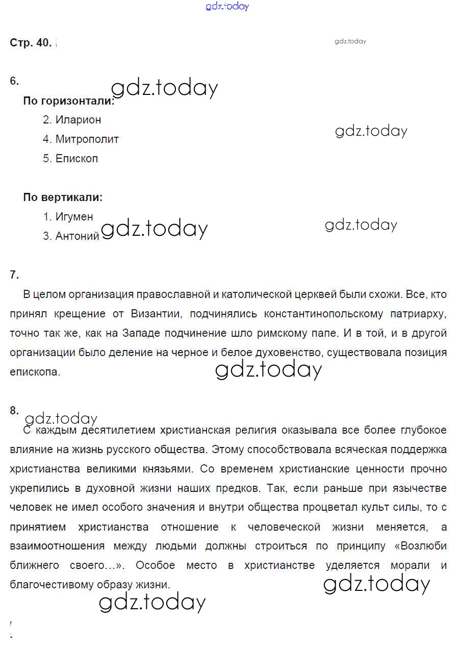 На страницах сайта gdz.today вы найдете учебный и вспомогательный материал, направленный на улучшения знаний школьной программы. ГДЗ - онлайн мир знаний Решение к §9 стр. 40 Рабочей тетради по Истории России для 6 класса Артасов, Данилов Просвещение 2016