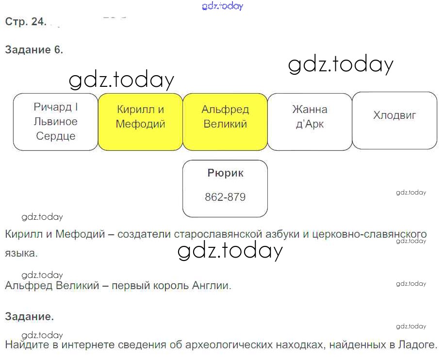На страницах сайта gdz.today вы найдете учебный и вспомогательный материал, направленный на улучшения знаний школьной программы. ГДЗ - онлайн мир знаний Решение к части 1. Страницы 24 Рабочей тетради по Истории России для 6 класса Чернова Экзамен УМК 2017