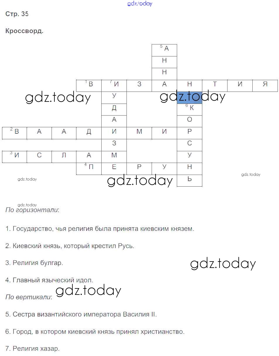 На страницах сайта gdz.today вы найдете учебный и вспомогательный материал, направленный на улучшения знаний школьной программы. ГДЗ - онлайн мир знаний Решение к части 1. Страницы 35 Рабочей тетради по Истории России для 6 класса Чернова Экзамен УМК 2017