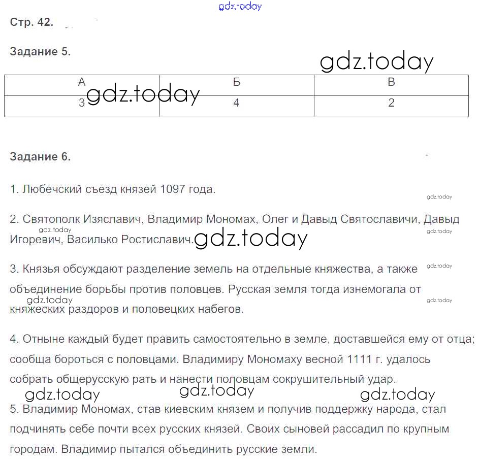 На страницах сайта gdz.today вы найдете учебный и вспомогательный материал, направленный на улучшения знаний школьной программы. ГДЗ - онлайн мир знаний Решение к части 1. Страницы 42 Рабочей тетради по Истории России для 6 класса Чернова Экзамен УМК 2017