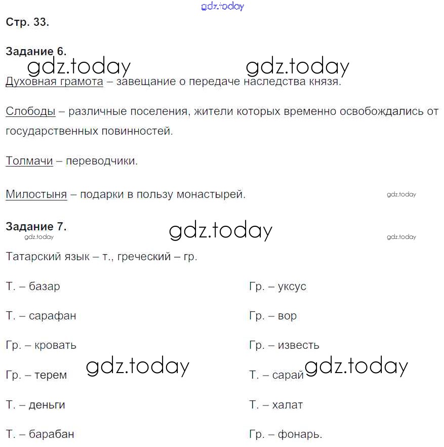 На страницах сайта gdz.today вы найдете учебный и вспомогательный материал, направленный на улучшения знаний школьной программы. ГДЗ - онлайн мир знаний Решение к части 2. Страницы 33 Рабочей тетради по Истории России для 6 класса Чернова Экзамен УМК 2017