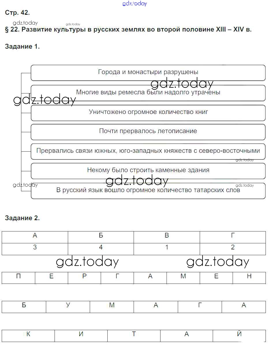 На страницах сайта gdz.today вы найдете учебный и вспомогательный материал, направленный на улучшения знаний школьной программы. ГДЗ - онлайн мир знаний Решение к части 2. Страницы 42 Рабочей тетради по Истории России для 6 класса Чернова Экзамен УМК 2017