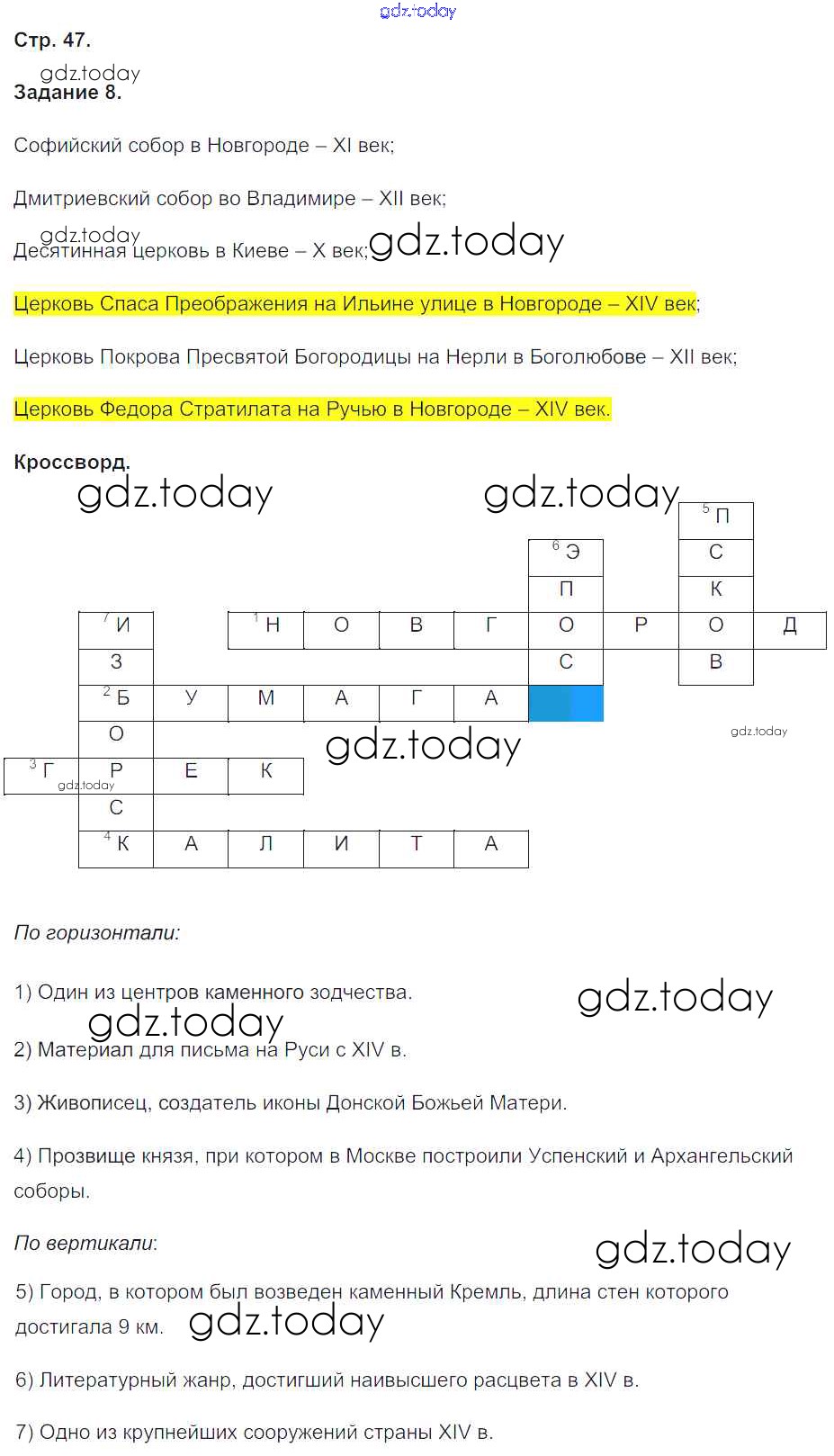 На страницах сайта gdz.today вы найдете учебный и вспомогательный материал, направленный на улучшения знаний школьной программы. ГДЗ - онлайн мир знаний Решение к части 2. Страницы 47 Рабочей тетради по Истории России для 6 класса Чернова Экзамен УМК 2017