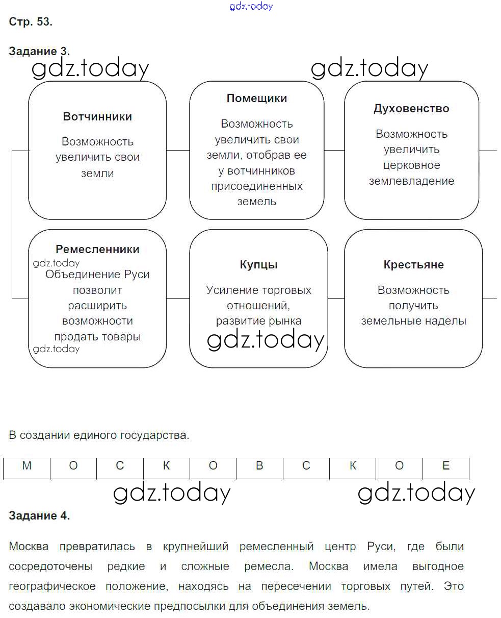 На страницах сайта gdz.today вы найдете учебный и вспомогательный материал, направленный на улучшения знаний школьной программы. ГДЗ - онлайн мир знаний Решение к части 2. Страницы 53 Рабочей тетради по Истории России для 6 класса Чернова Экзамен УМК 2017