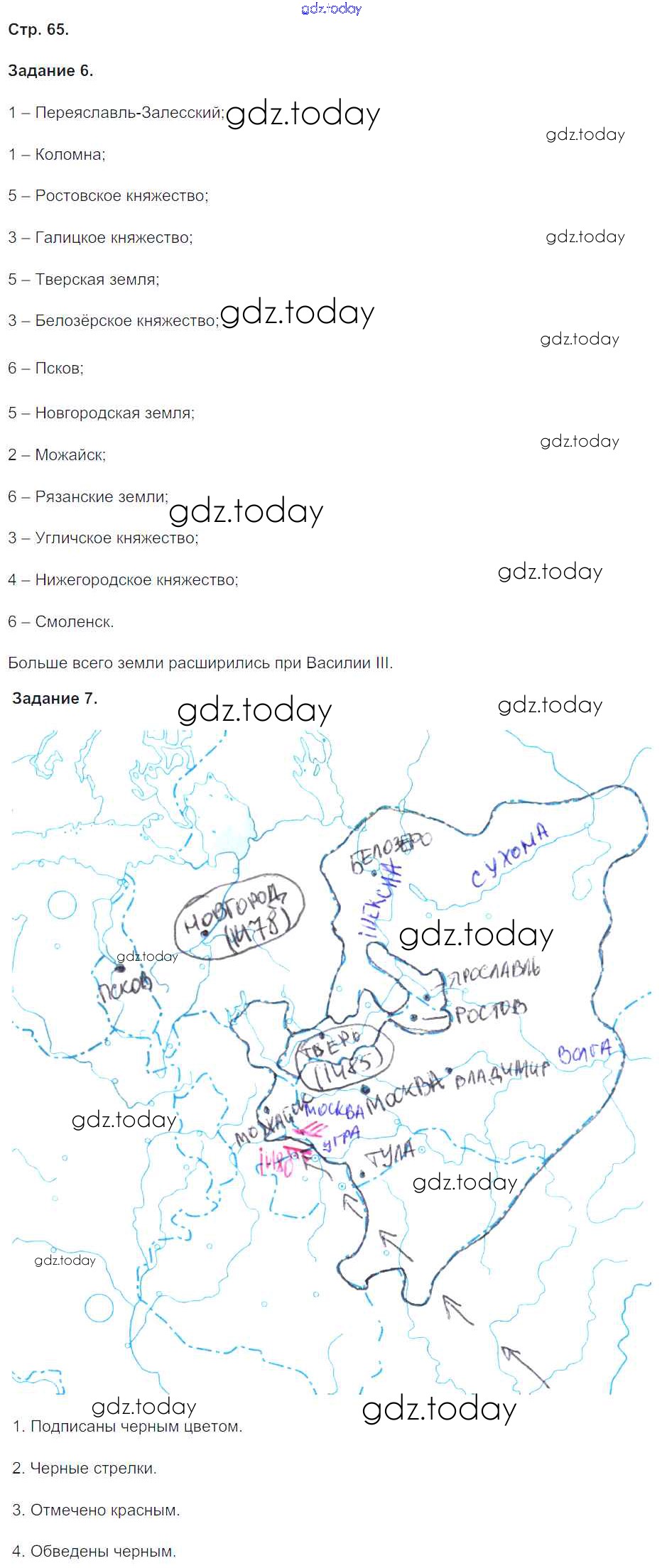 На страницах сайта gdz.today вы найдете учебный и вспомогательный материал, направленный на улучшения знаний школьной программы. ГДЗ - онлайн мир знаний Решение к части 2. Страницы 65 Рабочей тетради по Истории России для 6 класса Чернова Экзамен УМК 2017
