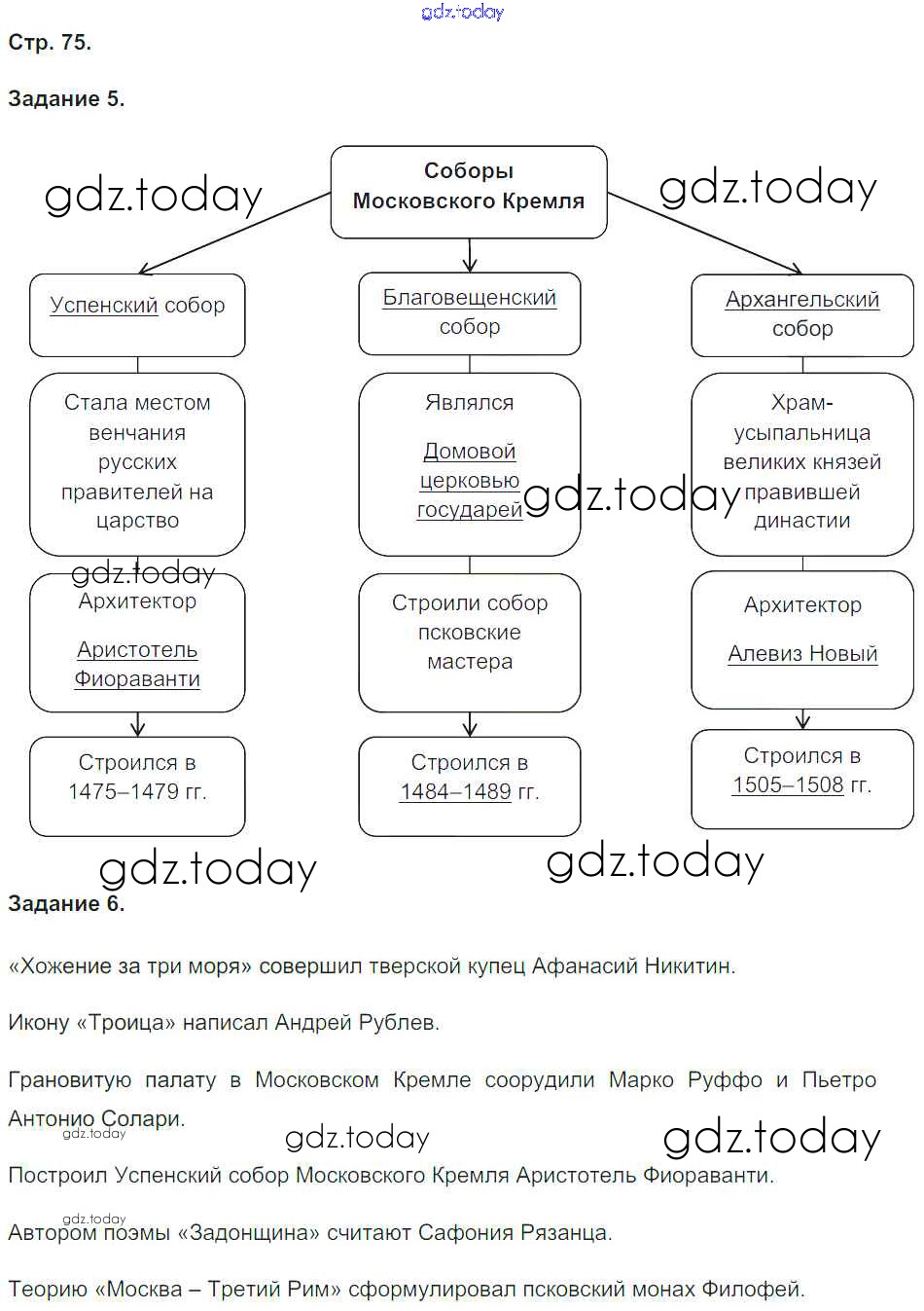 На страницах сайта gdz.today вы найдете учебный и вспомогательный материал, направленный на улучшения знаний школьной программы. ГДЗ - онлайн мир знаний Решение к части 2. Страницы 75 Рабочей тетради по Истории России для 6 класса Чернова Экзамен УМК 2017