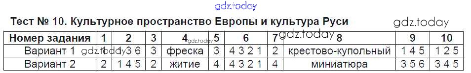 На страницах сайта gdz.today вы найдете учебный и вспомогательный материал, направленный на улучшения знаний школьной программы. ГДЗ - онлайн мир знаний Решение к тестам Тест №10. Культурное пространство Европы и культура Руси Тестам по Истории России для 6 класса Воробьёва Экзамен УМК 2017