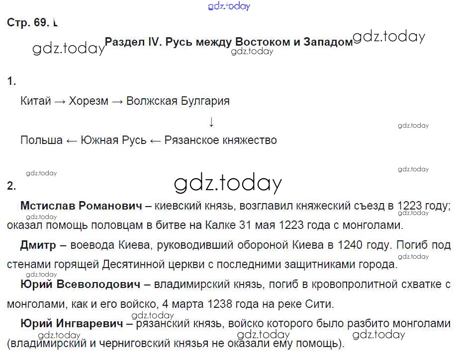 На страницах сайта gdz.today вы найдете учебный и вспомогательный материал, направленный на улучшения знаний школьной программы. ГДЗ - онлайн мир знаний Решение. Раздел 4. Русь между Востоком и Западом стр. 69 Рабочей тетради по Истории России для 6 класса Кочегаров Русское слово Инновационная школа 2017