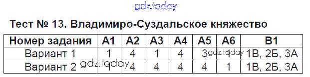 На страницах сайта gdz.today вы найдете учебный и вспомогательный материал, направленный на улучшения знаний школьной программы. ГДЗ - онлайн мир знаний Решение к тестам Тест №13. Владимиро-Суздальское княжество Контрольно-измерительным материалам (КИМ) по Истории России для 6 класса Волкова ВАКО 2017