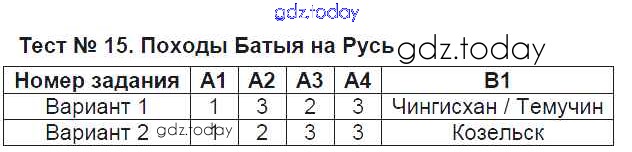 Ответы к Решение к тестам Тест №15. Походы Батыя на Русь Контрольно-измерительным материалам (КИМ) по Истории России для 6 класса Волкова ВАКО 2017