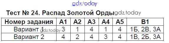 Ответы к Решение к тестам Тест №24. Распад Золотой Орды Контрольно-измерительным материалам (КИМ) по Истории России для 6 класса Волкова ВАКО 2017