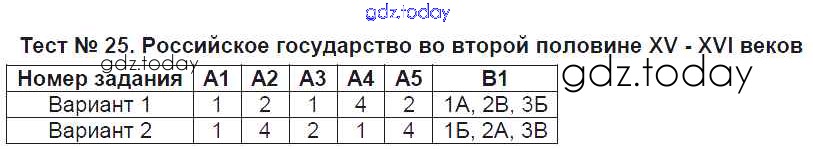 На страницах сайта gdz.today вы найдете учебный и вспомогательный материал, направленный на улучшения знаний школьной программы. ГДЗ - онлайн мир знаний Решение к тестам Тест №25. Российское государство во второй половине XV - XVI веков Контрольно-измерительным материалам (КИМ) по Истории России для 6 класса Волкова ВАКО 2017