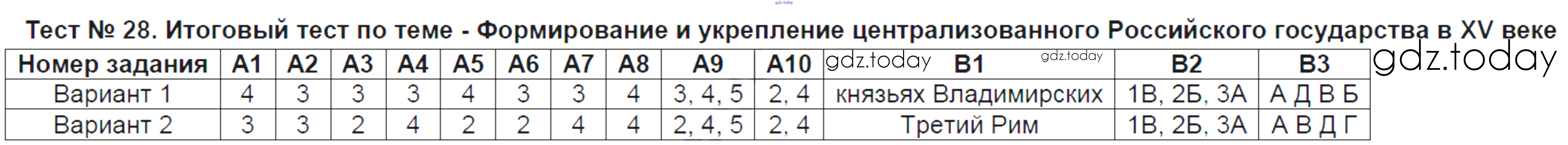 Ответы к Решение к тестам Тест №28. Итоговый тест по теме - Формирование и укрепление централизованного Российского государства в XV веке Контрольно-измерительным материалам (КИМ) по Истории России для 6 класса Волкова ВАКО 2017