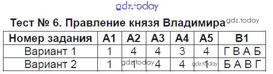 На страницах сайта gdz.today вы найдете учебный и вспомогательный материал, направленный на улучшения знаний школьной программы. ГДЗ - онлайн мир знаний Решение к тестам Тест №6. Правление князя Владимира Контрольно-измерительным материалам (КИМ) по Истории России для 6 класса Волкова ВАКО 2017